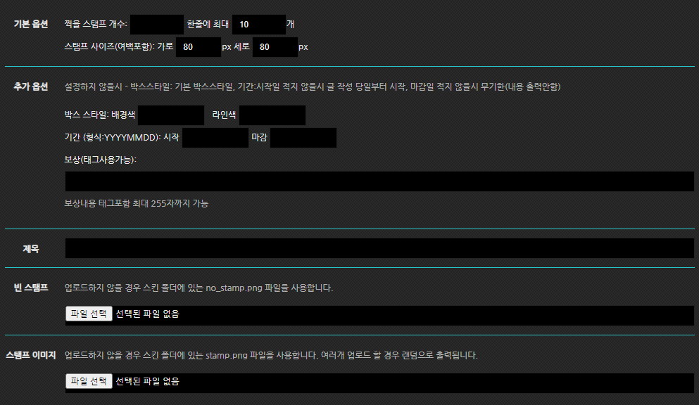 *마지막 스탬프 찍은 날짜를 확인할 수 있는 칸을 추가했습니다. 스킨폴더의 style.css 파일에서 /* 마지막 스탬프 날짜 */ 주석을 찾아 앞쪽에 위치한 display:none; 부분을 지우고 필요하다면 스타일을 추가로 수정하여 사용 해주세요.