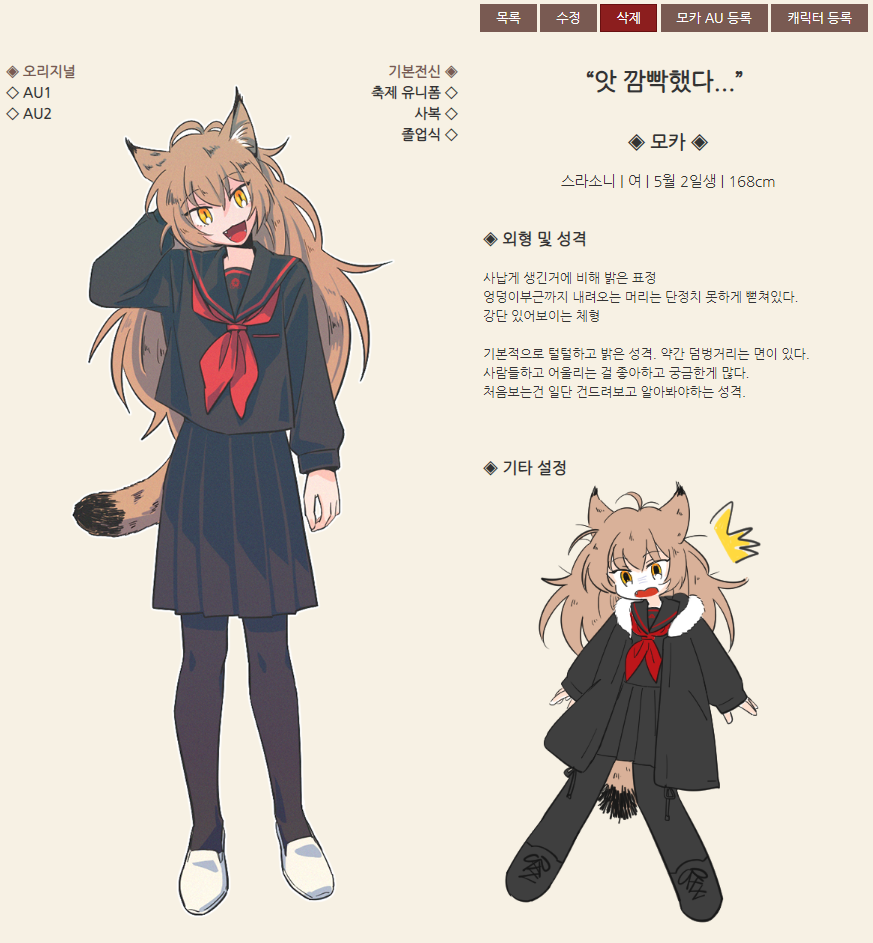 - 여분필드 1 값: 오리지널 세계관 명칭(공통) 본문에서 기본 프로필으로 가는 링크 제목을 설정합니다. 설정하지 않을 시 "오리지널"으로 표기됩니다(본문 프리뷰 전신 좌측 상단 참조)