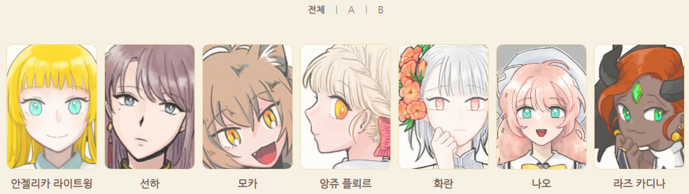 기존 캐릭터 게시판과는 달리 카테고리를 사용할 수 있으며(슬라이드형식 사용시 카테고리 사용불가) 썸네일 아래 캐릭터 이름이 출력됩니다. (슬라이드 형식에서는 출력되지 않음)