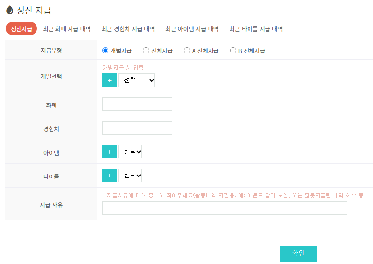 * 지급사유는 화폐나 경험치 내역에만 저장됩니다