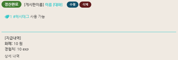 정산시 이런식으로 표시됩니다 (아이템이나 타이틀 지급시 지급된 아이템/타이틀명 나열)