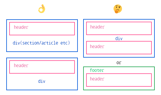 반드시 최상단에 위치할 필요도 없고 한 페이지 내에서 여러번 사용할 수는 있지만 header나 footer, 혹은 address 태그 안에 넣어서는 안됩니다.