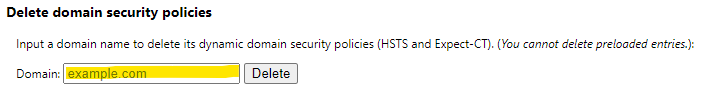 chrome://net-internals/#hsts 해당 페이지에 들어가 가장 아래 Delete domain security policies 항목에 강제 연결을 해제할 주소를 http:// 를 제거하고 입력해줍니다