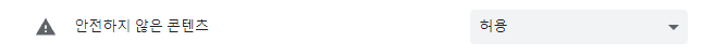 항목중 안전하지 않은 콘텐츠를 허용으로 설정합니다. 이 설정은 사이트별로 설정해야 해서 조금 번거로운 작업이 될 수도 있습니다.