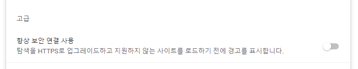 개인정보 및 보안 탭의 고급 항목 아래 항상 보안 연결 사용 설정을 해제합니다.