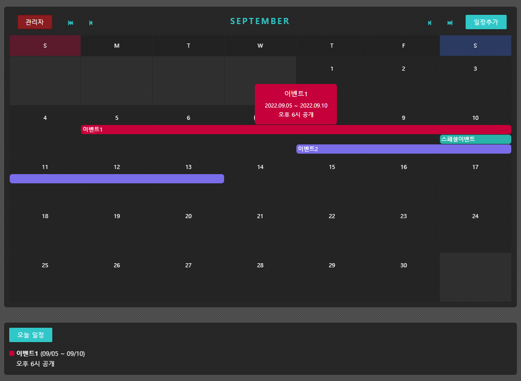 - 요약에 내용을 적으면 팝업레이어와 오늘의 일정에 해당 내용이 출력됩니다. (첫번째 미리보기 이미지의 '오후 6시 공개' 부분)