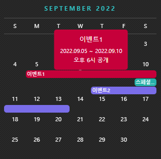 제목이 길어 잘리는 내용은 ... 으로 표시되며 해당 일정에 마우스오버하면 잘린 내용이 보입니다.