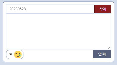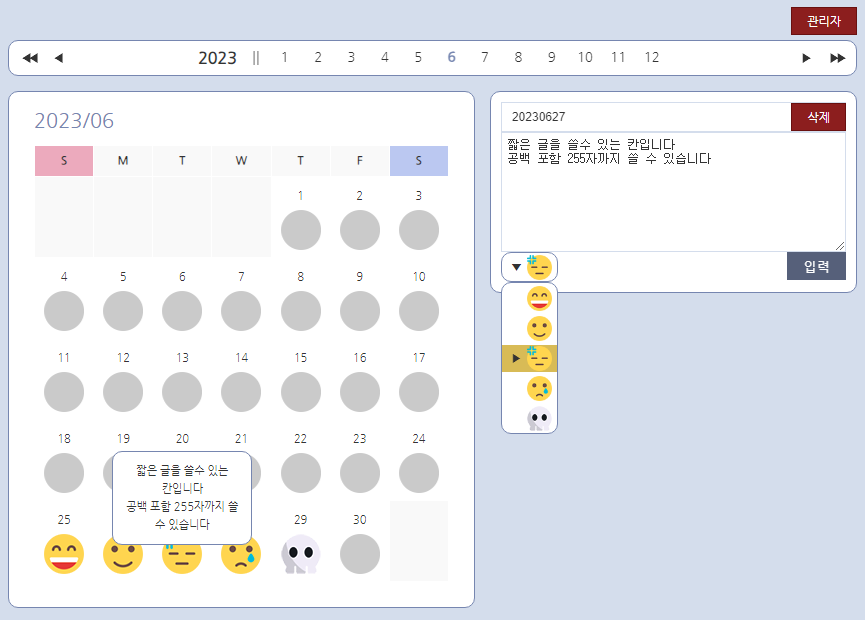 당일에 이미 무드를 체크한 경우 입력 버튼이 비활성화 된 상태로 보이지만 캘린더에서 해당 날짜의 아이콘을 누르면 글을 수정할 수 있으며 날짜 우측 에 삭제버튼을 눌러 글을 삭제하는것도 가능합니다.